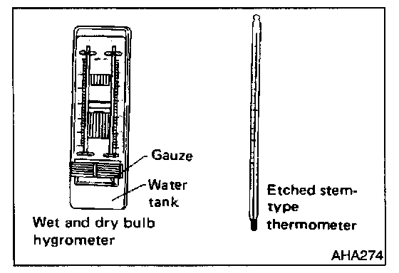 An etched stem-type thermometer and a hygrometer can be used to check the air conditioning system performance. A hygrometer is used because the air conditioning performance depends on the humidity.