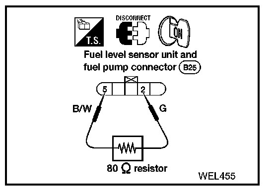 3. Connect a resistor (80 ohm) between fuel level sensor unit and fuel pump harness connector terminals 2 and 5.
