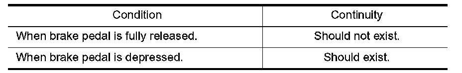 2. Check continuity between stop lamp switch terminals + and - under the given conditions.