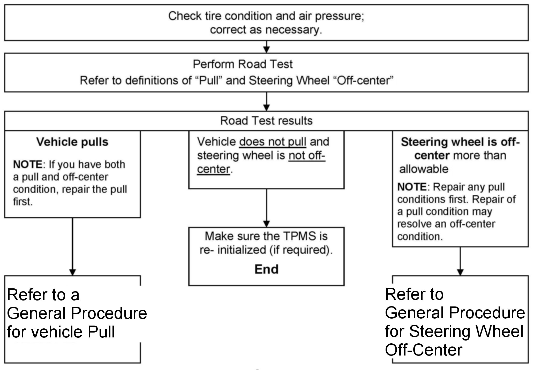 If a customers reports their "vehicle pulls" or the "steering wheel" is off-center, use the Diagnostic Flow Chart above and the other information in this bulletin to diagnose and correct the issue