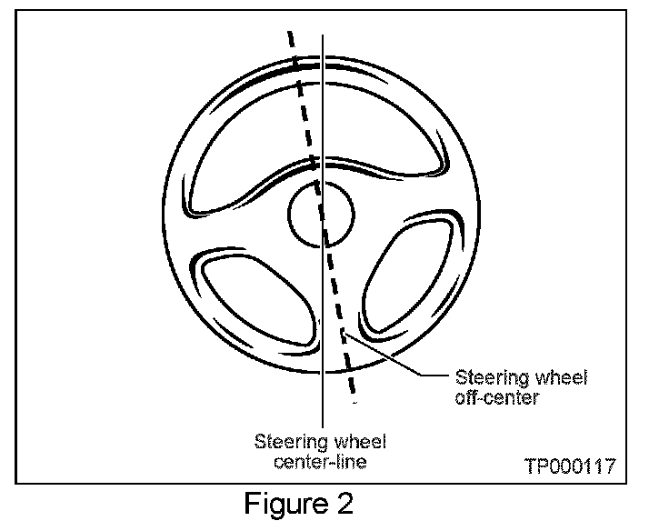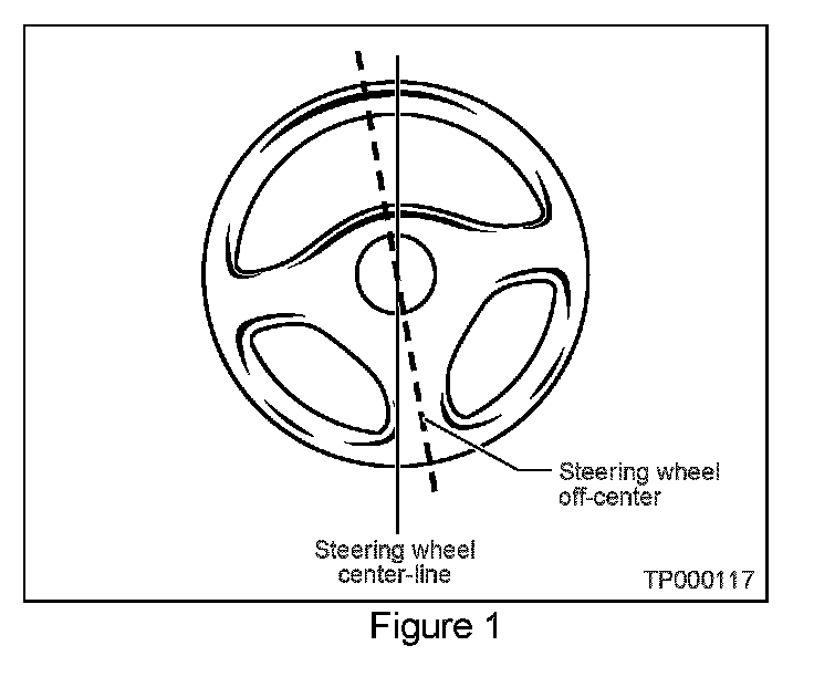 Customers may report that their vehicle's steering wheel is "off-center" because the steering wheel spokes are tilted to the left or right when the vehicle continues straight ahead on a straight flat road (see example in Figure 1).