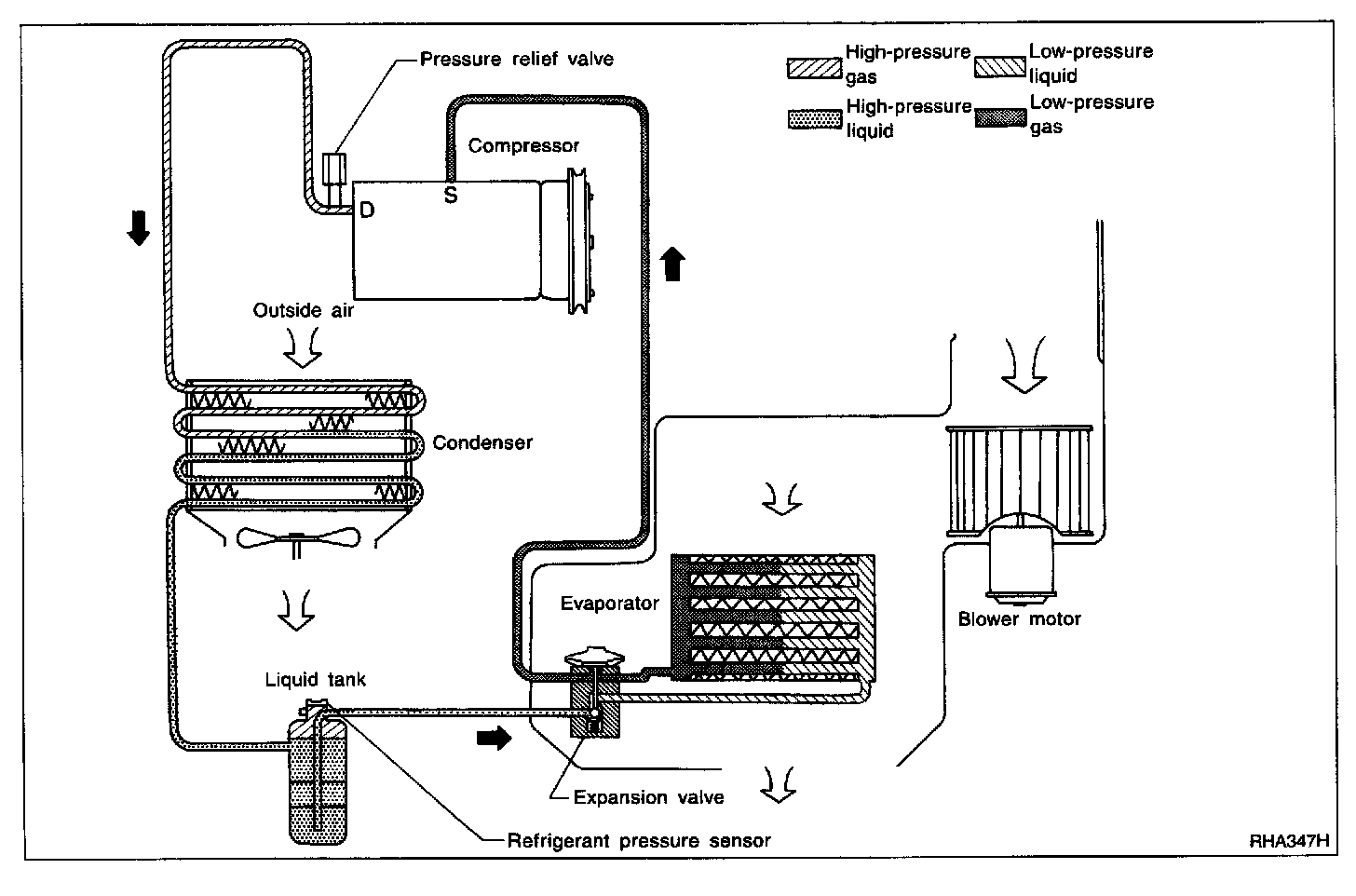 When the pressure of refrigerant in the system increases to an abnormal level [more than 3,727 kPa (38 kg/sq.cm, 540 psi)], the release port on the pressure relief valve automatically opens and releases refrigerant into