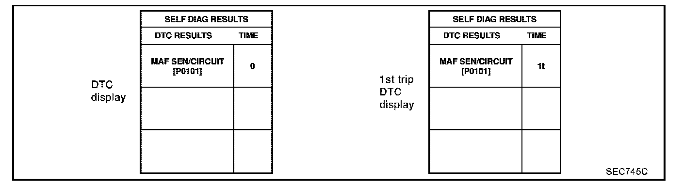 A sample of CONSULT-II display for DTC and 1st trip DTC is shown. DTC or 1st trip DTC of a malfunction is displayed in SELF-DIAGNOSTIC RESULTS mode of CONSULT-II. Time data indicates how many times the vehicle was driven after the last detection of a DTC.
