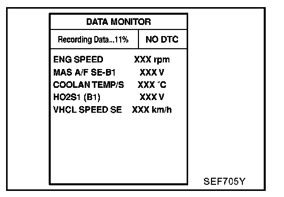 At the moment a malfunction is detected by ECM, "MONITOR" in "DATA MONITOR" screen is changed to "Recording Data... xx%" as shown, and the data after the malfunction detection is recorded. Then when the percentage reached 100%, "REAL-TIME DIAG" screen is displayed. If "STOP" is touched on the screen during "Recording Data... xx%", "REAL-TIME DIAG" screen is also displayed.