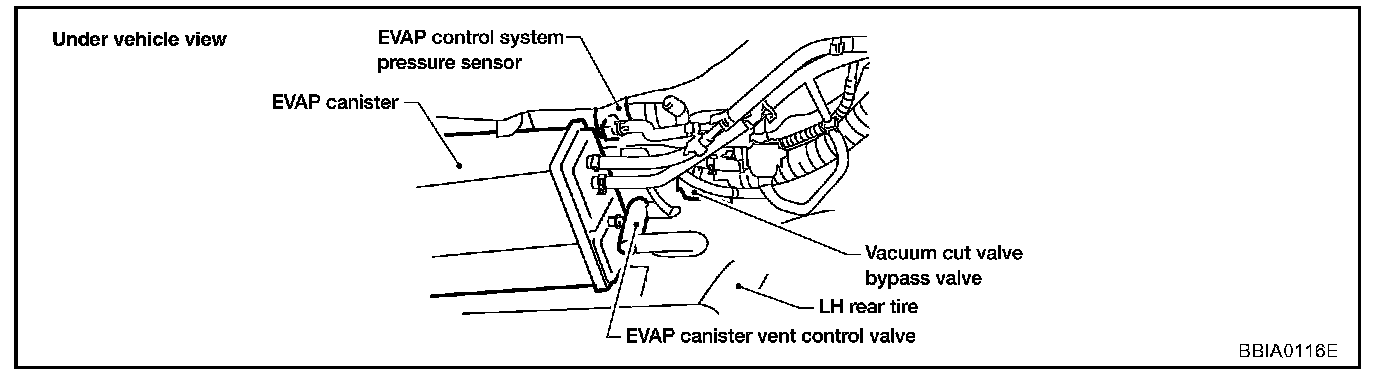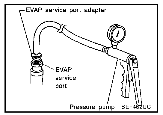 Positive pressure is delivered to the EVAP system through the EVAP service port. If fuel vapor leakage in the EVAP system occurs, use a leak detector to locate the leak.