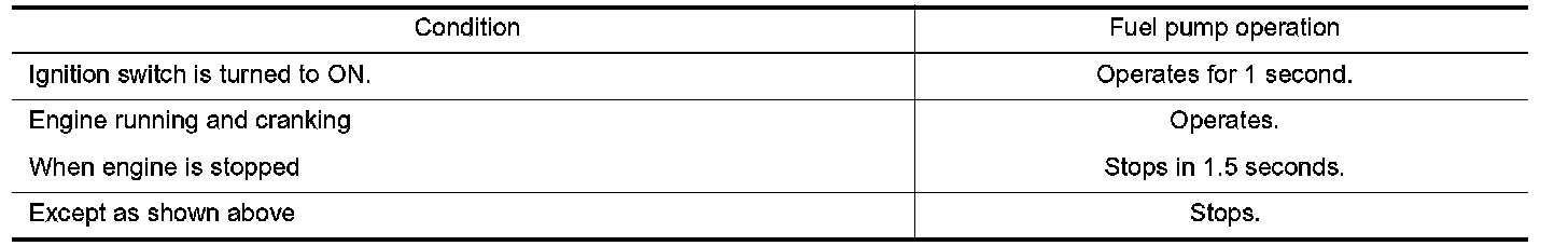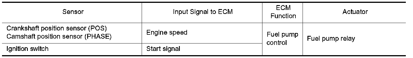 The ECM activates the fuel pump for several seconds after the ignition switch is turned on to improve engine startability. If the ECM receives a engine speed signal from the crankshaft position sensor (POS) and cam shaft position sensor (PHASE), it knows that the engine is rotating, and causes the pump to operate. If the engine speed signal is not received when the ignition switch is ON, the engine stalls. The ECM stops pump operation and prevents battery discharging, thereby improving safety. The ECM does not directly drive the fuel pump. It controls the ON/OFF fuel pump relay, which in turn controls the fuel pump.