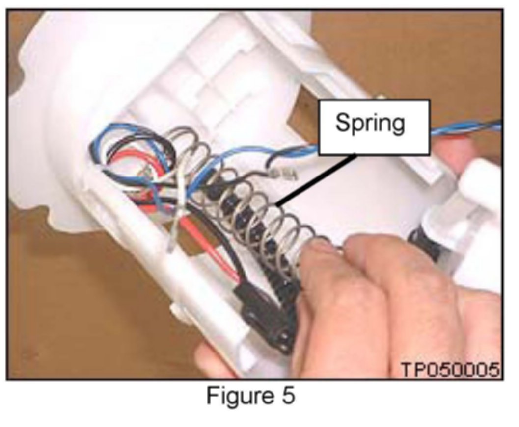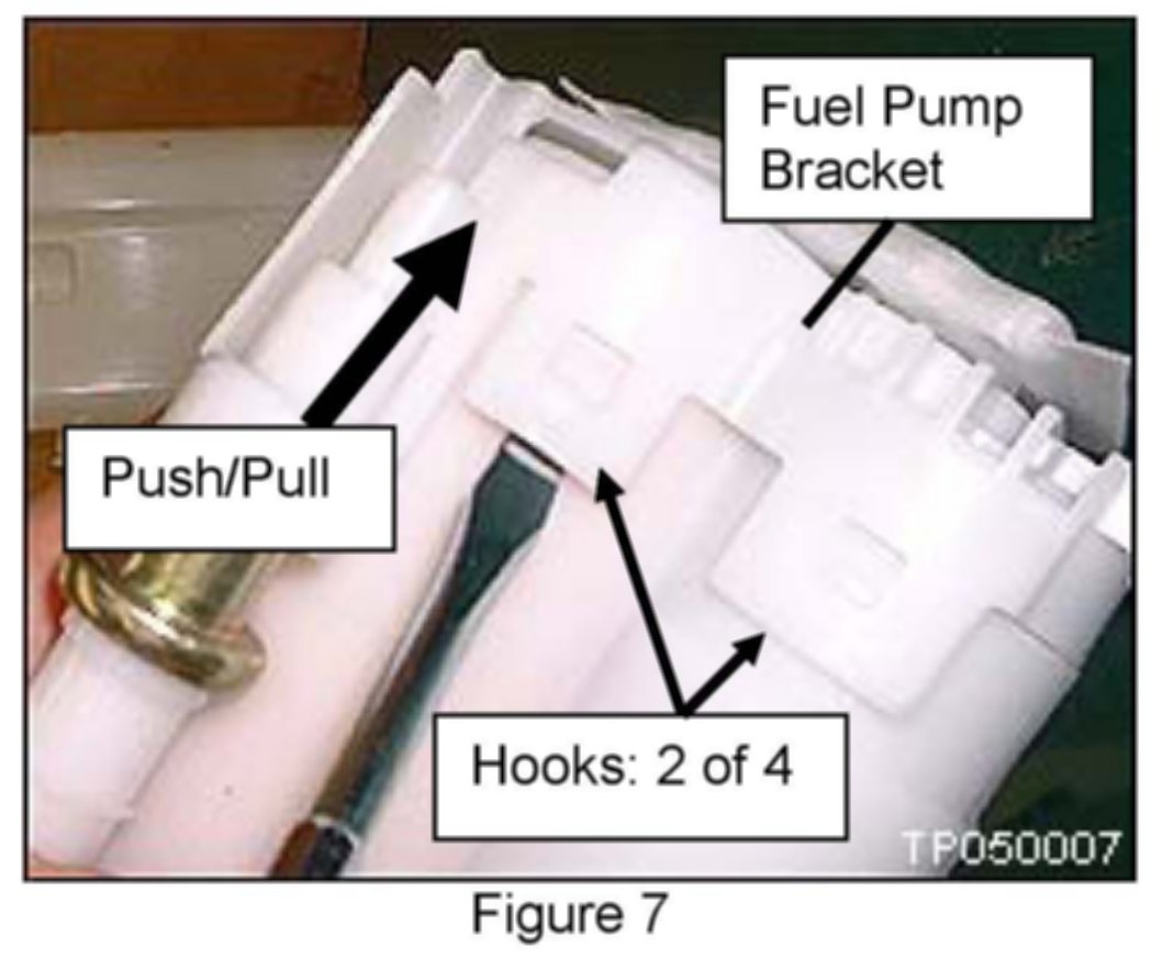 9. Carefully remove the fuel pump bracket shown in Figures 6 and 7.
