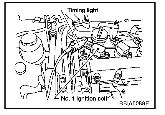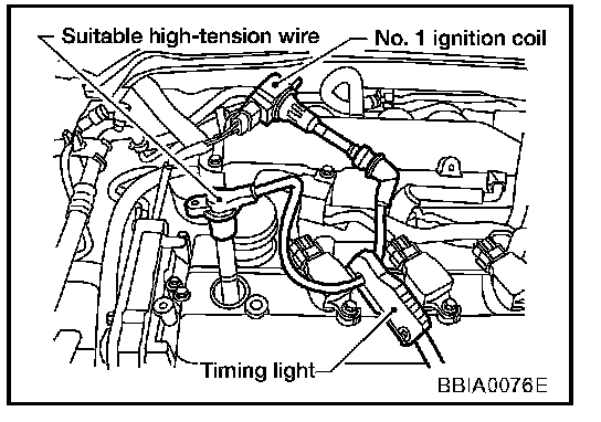 2. Connect No. 1 ignition coil and No. 1 spark plug with suitable high-tension wire as shown, and attach timing light clamp to this wire.