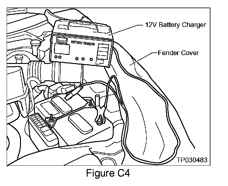 8. Connect a battery charger (or a "known good" additional 12V battery) to the vehicle battery (see Figure C4).