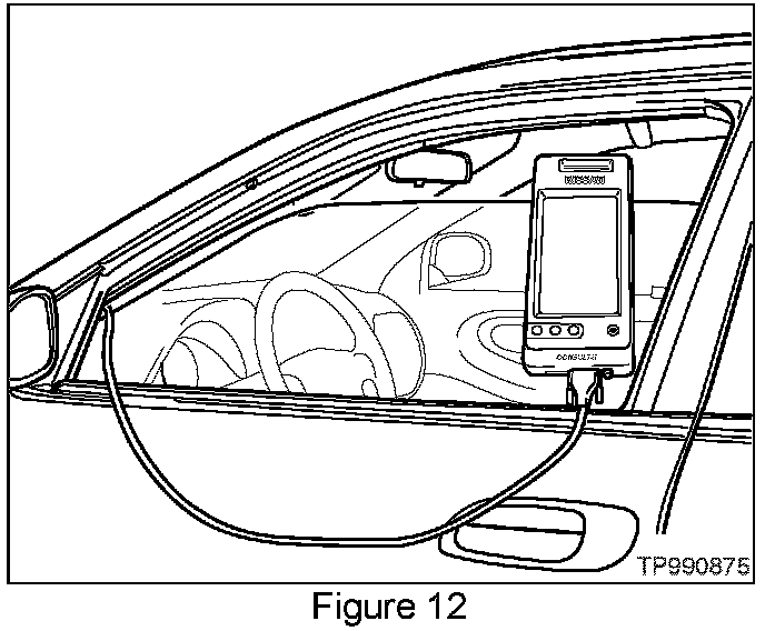 16. Roll down the driver's window part way, exit the vehicle, close the door, and hang the CONSULT II unit on the outside of the window (see Figure 12).