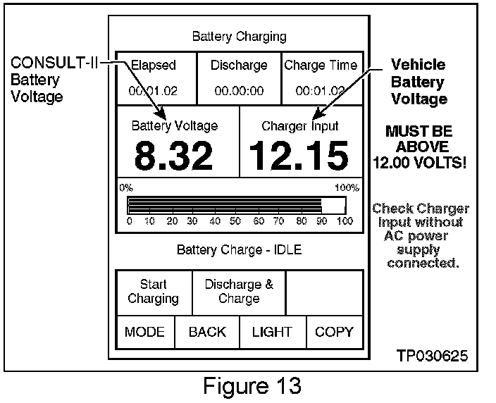 18. Check the CONSULT-II's "Charger Input "reading (see Figure 13).