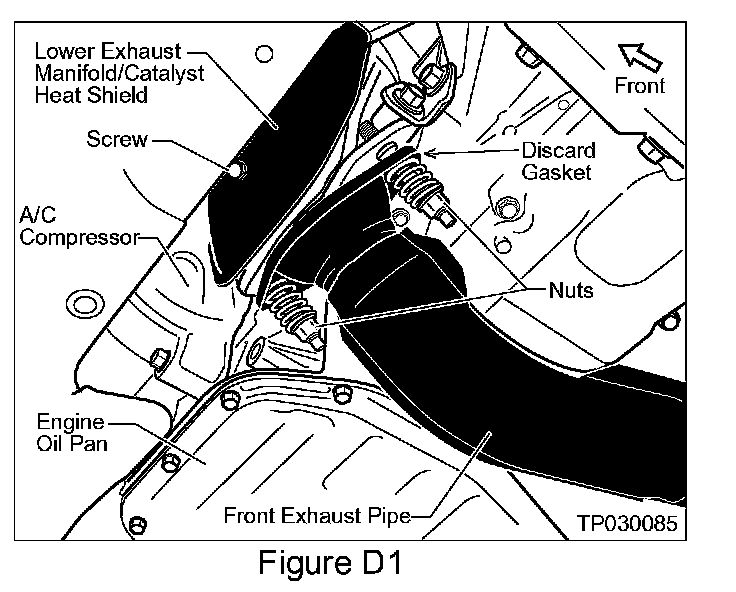 1. Remove the two nuts that secure the Front Exhaust Pipe to the Exhaust Manifold/Catalyst (see Figure D1). Discard the old gasket as you'll be installing a new one later.