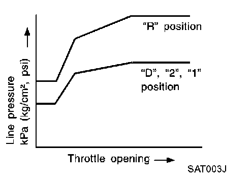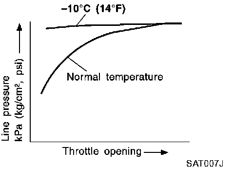 - Line pressure is increased to a maximum irrespective of the throttle opening when fluid temperature drops to -10°C (14°F). This pressure rise is adopted to prevent a delay in clutch and brake operation due to extreme drop of fluid viscosity at low temperature.