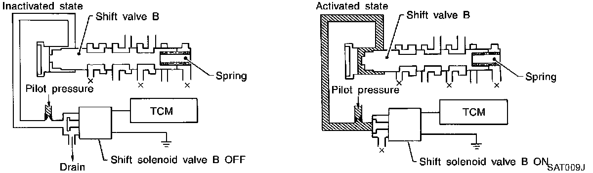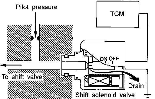 The shift solenoid valve performs simple ON-OFF operation. When set to ON, the drain circuit closes and pilot pressure is applied to the shift valve.