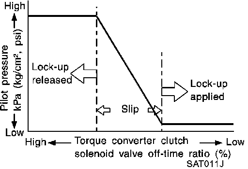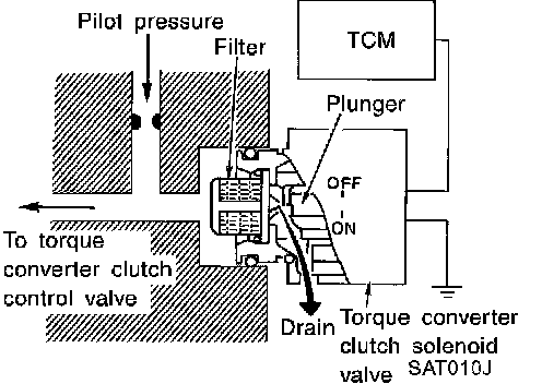 The torque converter clutch solenoid valve is controlled by the TCM. The plunger closes the drain circuit during the OFF period, and opens the circuit during the ON period. If the percentage of OFF time increases in one cycle, the pilot pressure drain time is reduced and pilot pressure remains high.