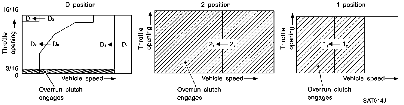 If the selector lever is shifted to 2 position while driving in Do (O/D) or Ds, great driving force is applied to the clutch inside the transmission. Clutch operating pressure (line pressure) must be increased to deal with this driving force.