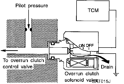 The overrun clutch solenoid valve is operated by an ON-OFF signal transmitted by the TCM to provide overrun clutch control (engine brake control).