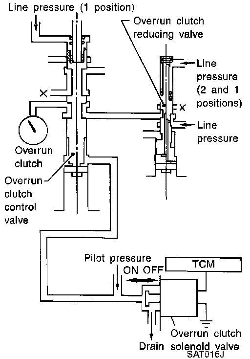 During the solenoid valve ON pilot pressure is applied to the end face of the overrun clutch control valve.
