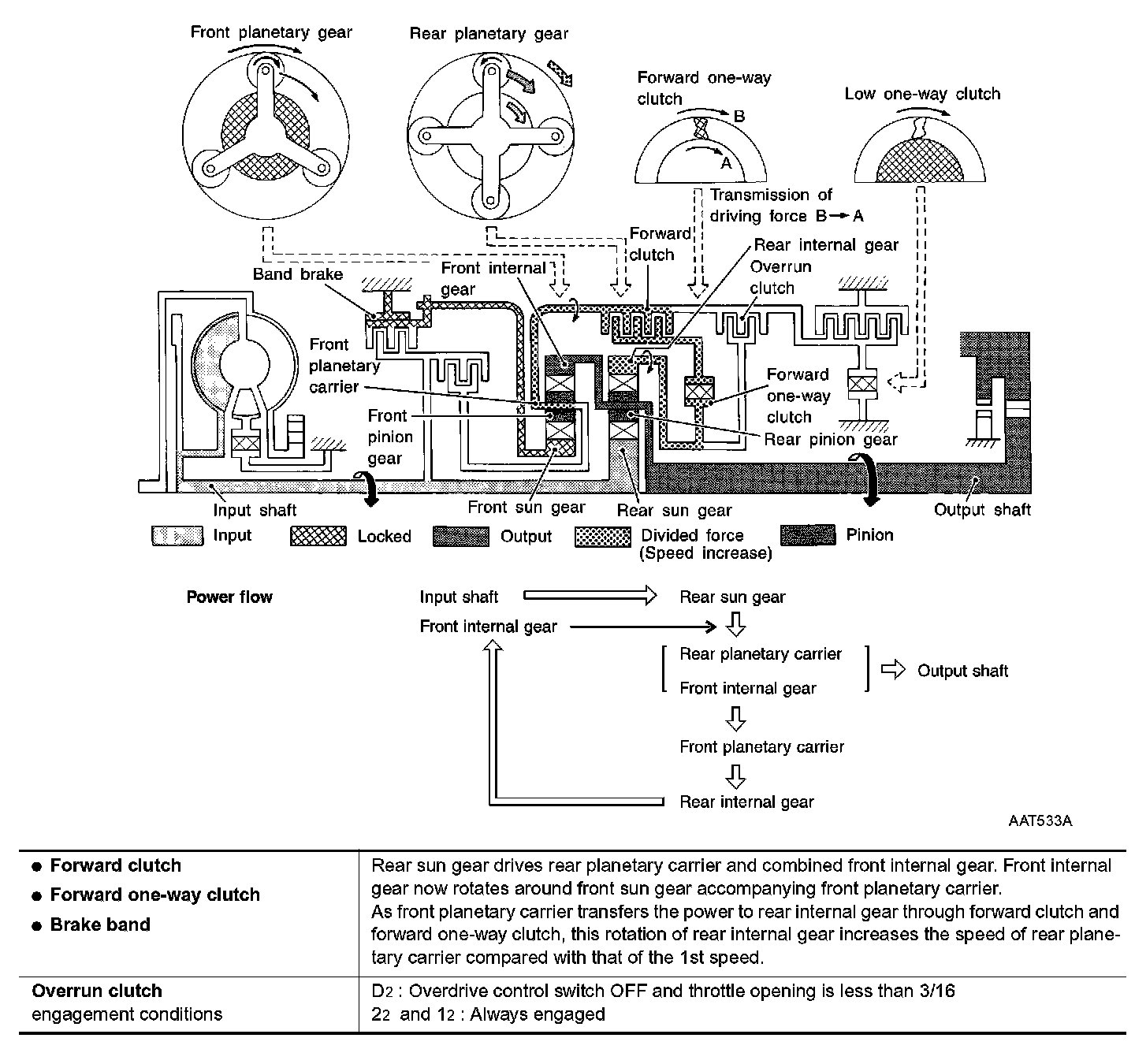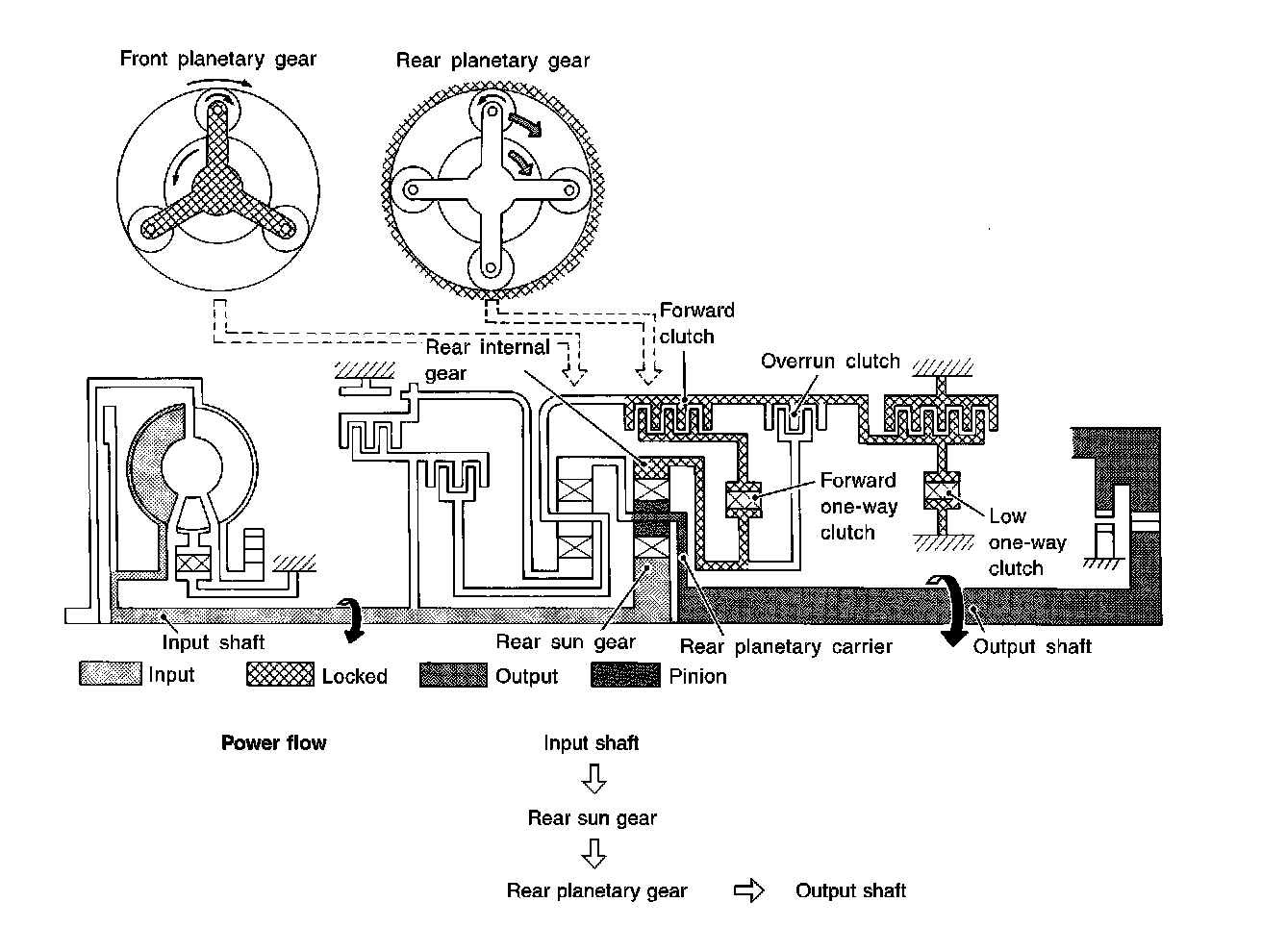 - Forward clutch Rear sun gear drives rear planetary carrier and combined front internal gear. Front internal gear now rotates around front sun gear accompanying front planetary carrier. As front planetary carrier transfers the power to rear internal gear through forward clutch and forward one-way clutch, this rotation of rear internal gear increases the speed of rear planetary carrier compared with that of the 1st speed.