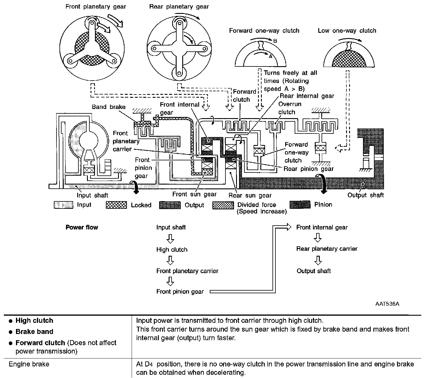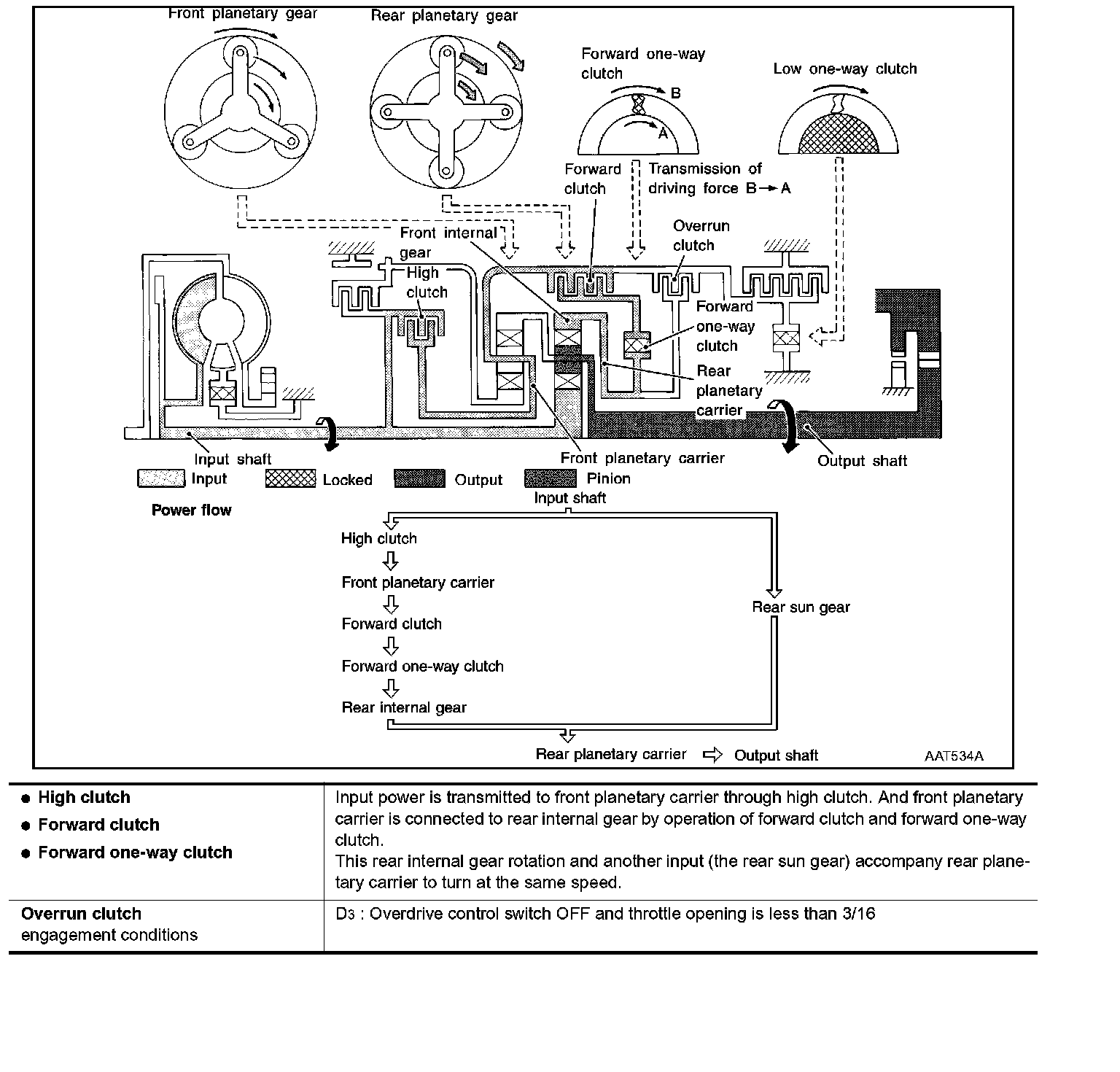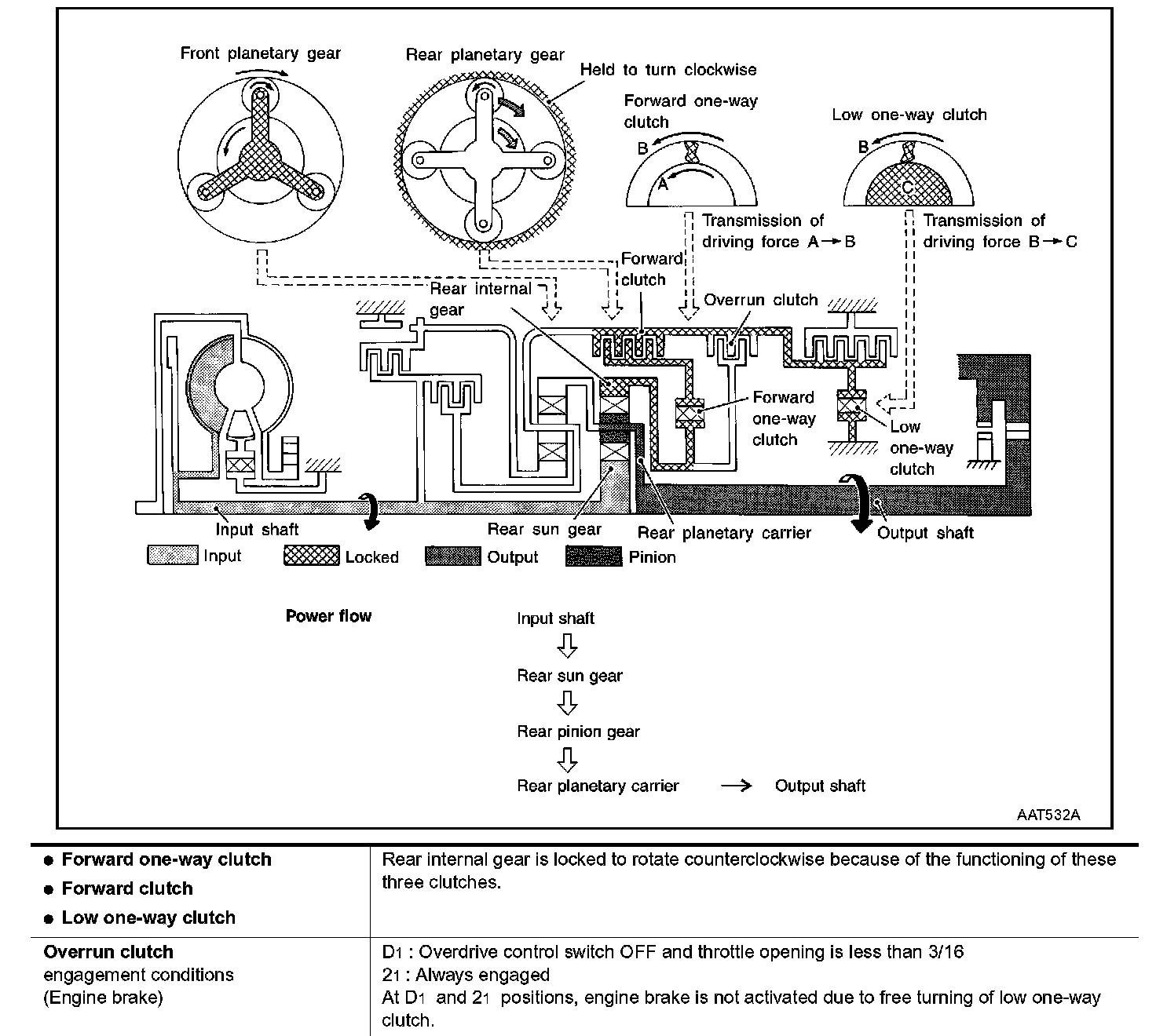 - Forward clutch As overrun clutch engages, rear internal gear is locked by the operation of low and reverse brake.