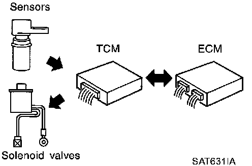The TCM also communicates with the ECM by means of a signal sent from sensing elements used with the OBD-related parts of the A/T system for malfunction-diagnostic purposes. The TCM is capable of diagnosing malfunctioning parts while the ECM can store malfunctions in its memory.