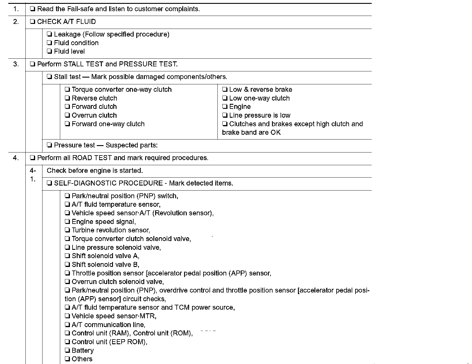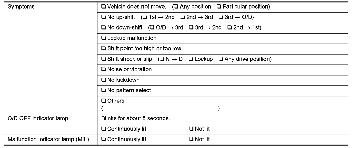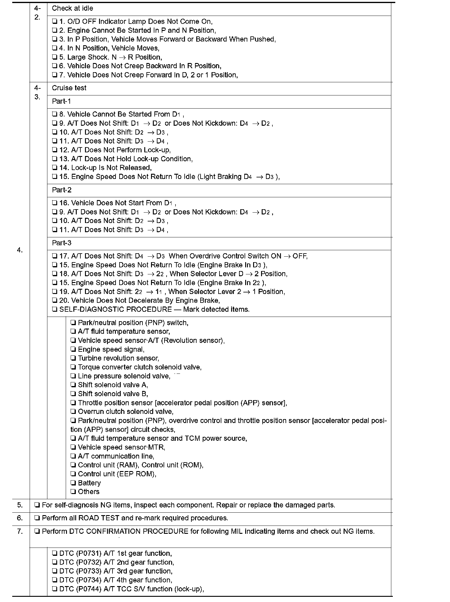 Input and output signals must always be correct and stable in the operation of the A/T system. The A/T system must be in good operating condition and be free of valve seizure, solenoid valve malfunction, etc.