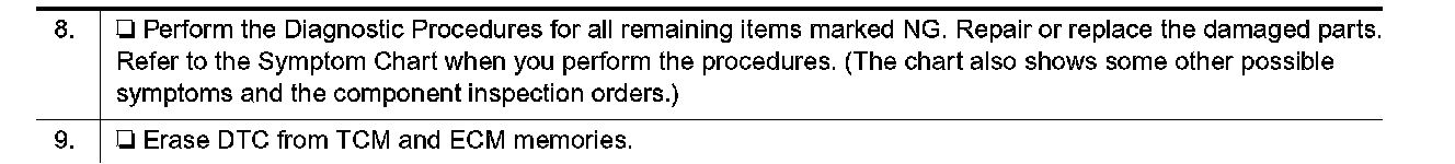 A visual check only, may not find the cause of the problems. A road test with CONSULT-II (or GST) or a circuit tester connected should be performed. Follow the "Work Flow".