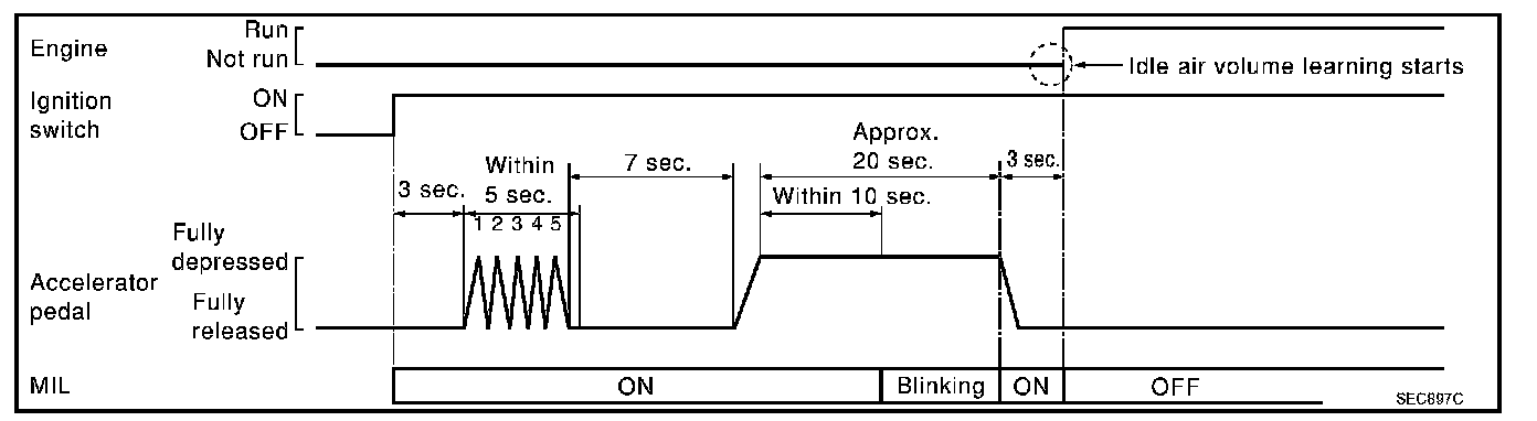 6. Confirm that accelerator pedal is fully released, turn ignition switch "ON" and wait 3 seconds.