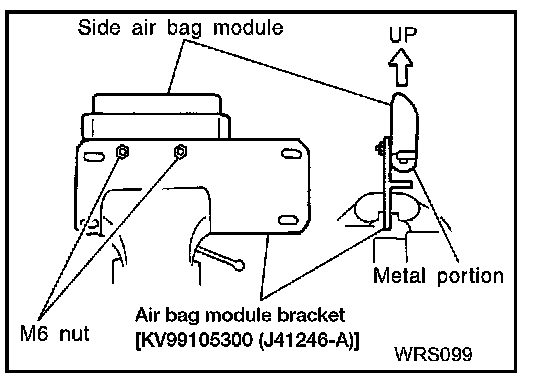 CAUTION: Front side air bag module should be secured to air bag module bracket [SST: KV99105300 (J-41246-A)] in a vise with metal portion facing down.