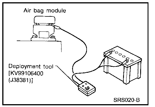 NOTE: Before disposing of air bag modules and seat belt pre-tensioners, or vehicles equipped with such systems, deploy the systems. If such systems have already been deployed due to an accident, dispose of as indicated in DISPOSING OF AIR BAG MODULE AND SEAT BELT PRE-TENSIONER".When deploying air bag module or seat belt pre-tensioner, always use the Special Service Tool; Deployment tool KV99106400 (Kent-Moore No. J38381).