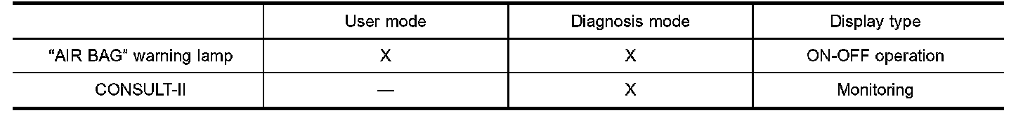 The SRS self-diagnosis results can be read by using "AIR BAG" warning lamp and/or CONSULT-II. The reading of these results is accomplished using one of two modes "User mode" and "Diagnosis mode". The User mode is exclusively prepared for the customer (driver). This mode warns the driver of a system malfunction through the operation of the "AIR BAG" warning lamp.
