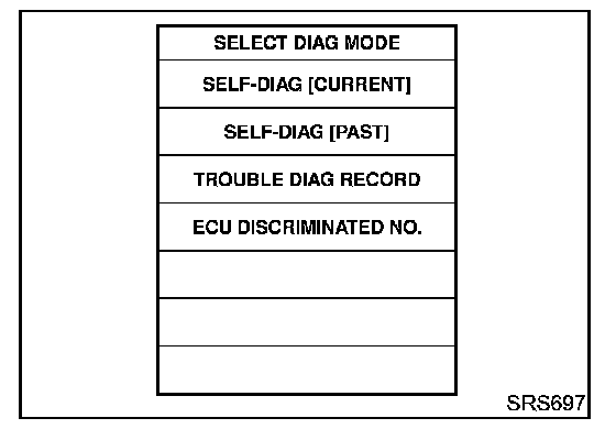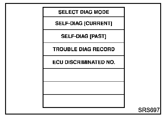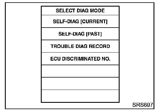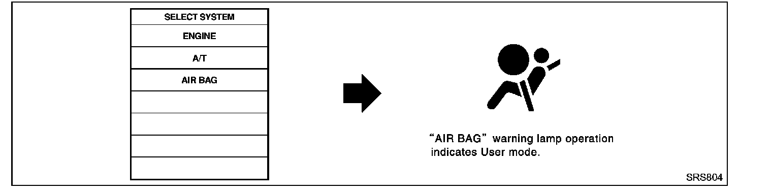 DIAGNOSIS FUNCTIONThe SRS self-diagnosis results can be read by using "AIR BAG" warning lamp and/or CONSULT-II. The reading of these results is accomplished using one of two modes "User mode" and "Diagnosis mode". The User mode is exclusively prepared for the customer (driver). This mode warns the driver of a system malfunction through the operation of the "AIR BAG" warning lamp.