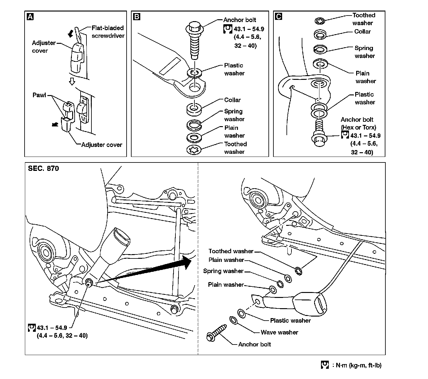 9. Remove bolts securing seat belt adjuster, then remove seat belt adjuster.