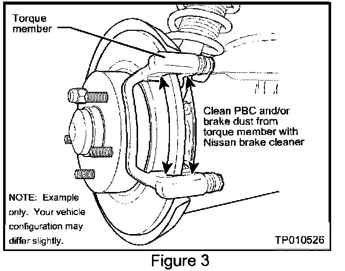 7. Use Nissan Brake Cleaner (P/N 999MP-A3042) to remove the old PBC (Poly Butyl Cuprysil) grease and/or brake dust from the "torque member" (see Figure 3).