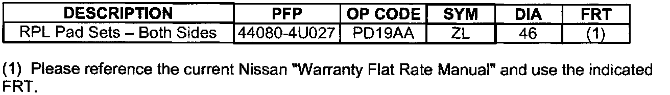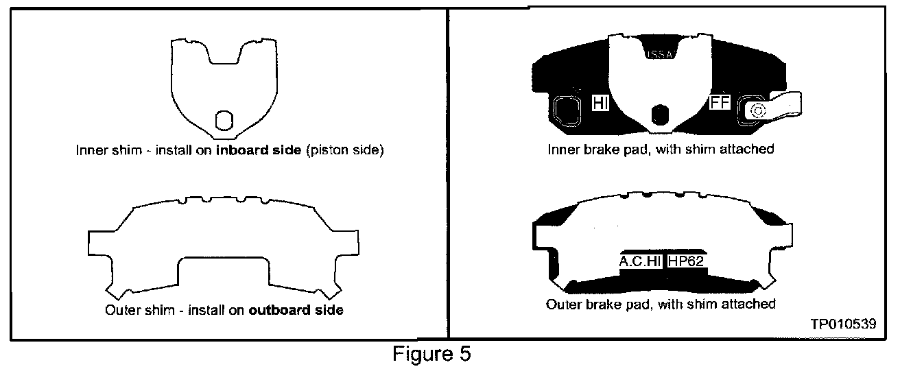 ^ Use PBC grease (Nissan P/N 99990-00939P) between the brake pad and shim, and between the shim and piston to reduce potential noise. Use it sparingly (do not use too much). DO NOT GET ANY PBC GREASE ON THE BRAKE PAD "FRICTION" SURFACES.