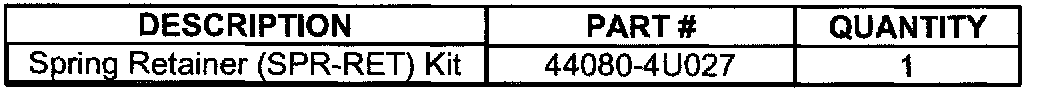 A replacement Spring Retainer (SPR-RET) Kit, consisting of replacement pad retainers, inner and outer shims, and brake pads is available to address this condition. Use the Service Procedure provided in this bulletin to diagnose and repair this incident, if it should occur.