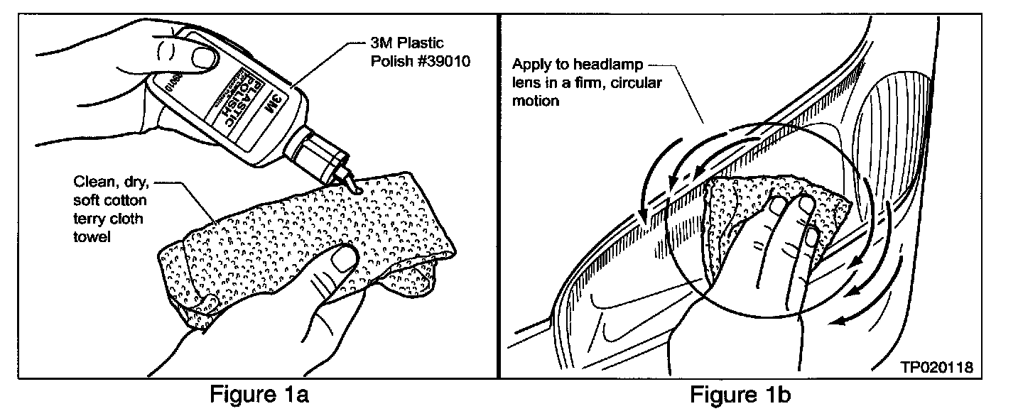 Use 3M Plastic Polish(TM) (# 39010) to polish the headlamp lens(es) as follows: