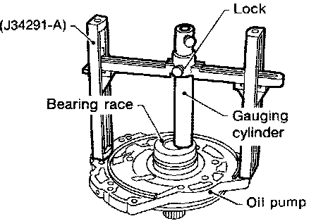 a. With original bearing race installed, place Tool onto oil pump. The long ends of legs should be placed firmly on machined surface of oil pump assembly. The gauging cylinder should rest on top of bearing race. Lock gauging cylinder in place with set screw.