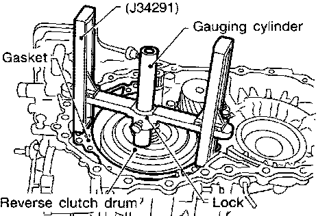 a. Place Tool on machined surface of transmission case (with gasket). Then allow gauging cylinder to rest on reverse clutch drum. Lock cylinder in place with set screw.