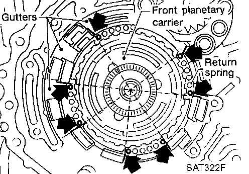 a. Set and align return springs to transmission case gutters as shown in illustration.