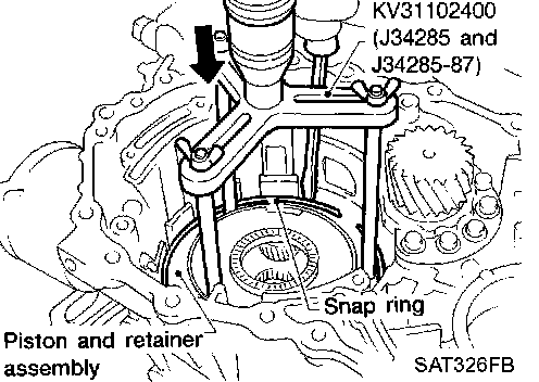 e. Push down piston and retainer assembly and install snap ring.