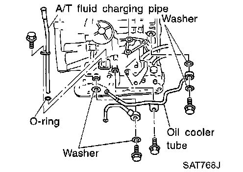 4. Remove A/T fluid charging pipe and fluid cooler tube.