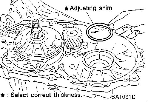 23. Remove differential side bearing adjusting shim from transmission case.