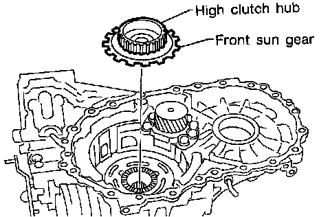 d. Remove high clutch hub and front sun gear from transmission case.