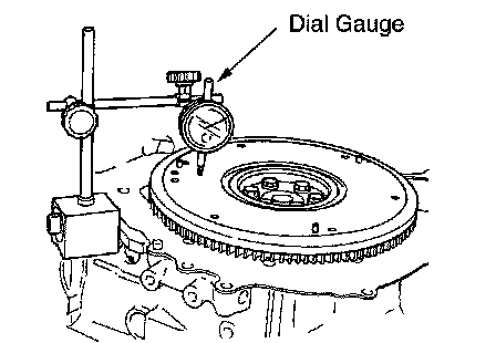 ^ Measure deflection of flywheel contact surface to the clutch with a dial gauge.
