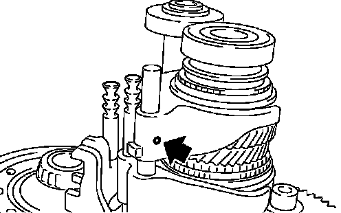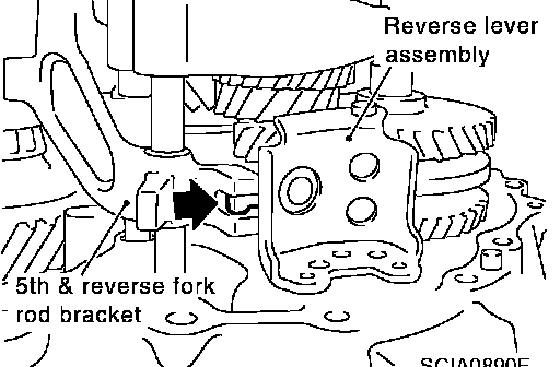 b. While lifting reverse shift fork, align cam with 5th-reverse bracket.