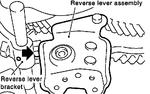 13. With shift lever in 5th position, remove bracket bolts from reverse lever assembly. Lift reverse lever assembly to remove.