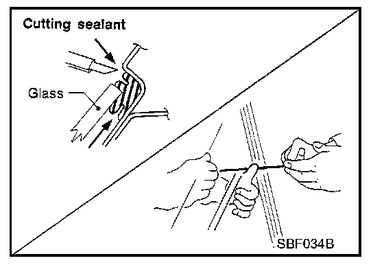 After removing interior moldings and trim to access edge of glass, remove glass using piano wire or power cutting tool and an inflatable pump bag.