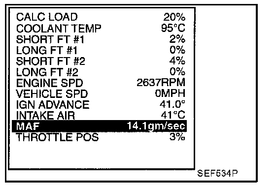 3. Check the mass air flow sensor signal with "MODE 1".