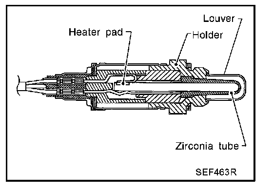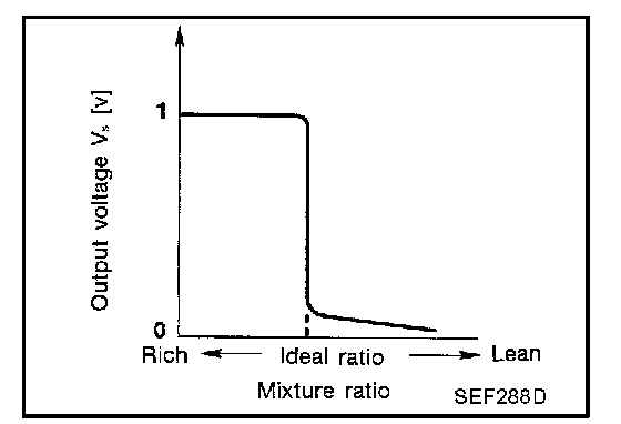 The heated oxygen sensor 1 is placed into the exhaust manifold. It detects the amount of oxygen in the exhaust gas compared to the outside air. The heated oxygen sensor 1 has a closed-end tube made of ceramic zirconia. The zirconia generates voltage from approximately 1V in richer conditions to 0V in leaner conditions. The heated oxygen sensor 1 signal is sent to the ECM. The ECM adjusts the injection pulse duration to achieve the ideal air-fuel ratio. The ideal air-fuel ratio occurs near the radical change from 1V to 0V.